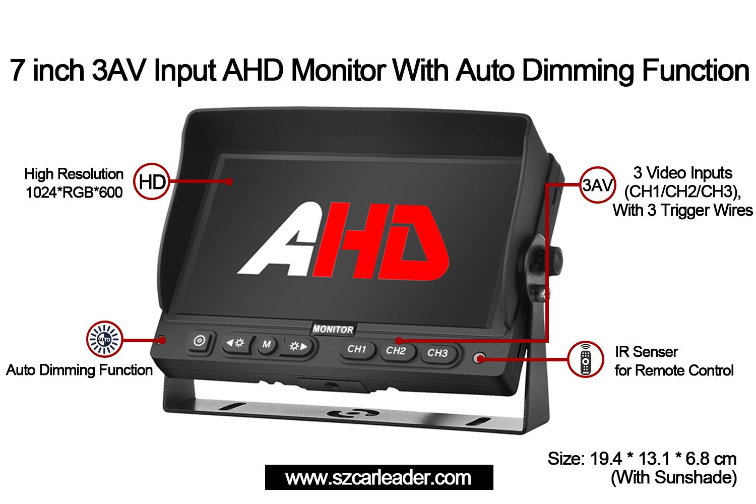 கடற்படை மேலாண்மை, பாதுகாப்பு கண்காணிப்பு அல்லது தொழில்துறை பயன்பாடு, கார்லீடர் ஆகியவற்றிற்கு ஏற்றது7 இன்ச் 3CH AHD உள்ளீடுகள் வாகன காப்பு மானிட்டர்நம்பகத்தன்மை, பல்துறை மற்றும் பயனர்களை மையமாகக் கொண்ட கண்டுபிடிப்பு ஆகியவற்றை ஒரு சிறிய வடிவத்தில் ஒருங்கிணைக்கிறது.