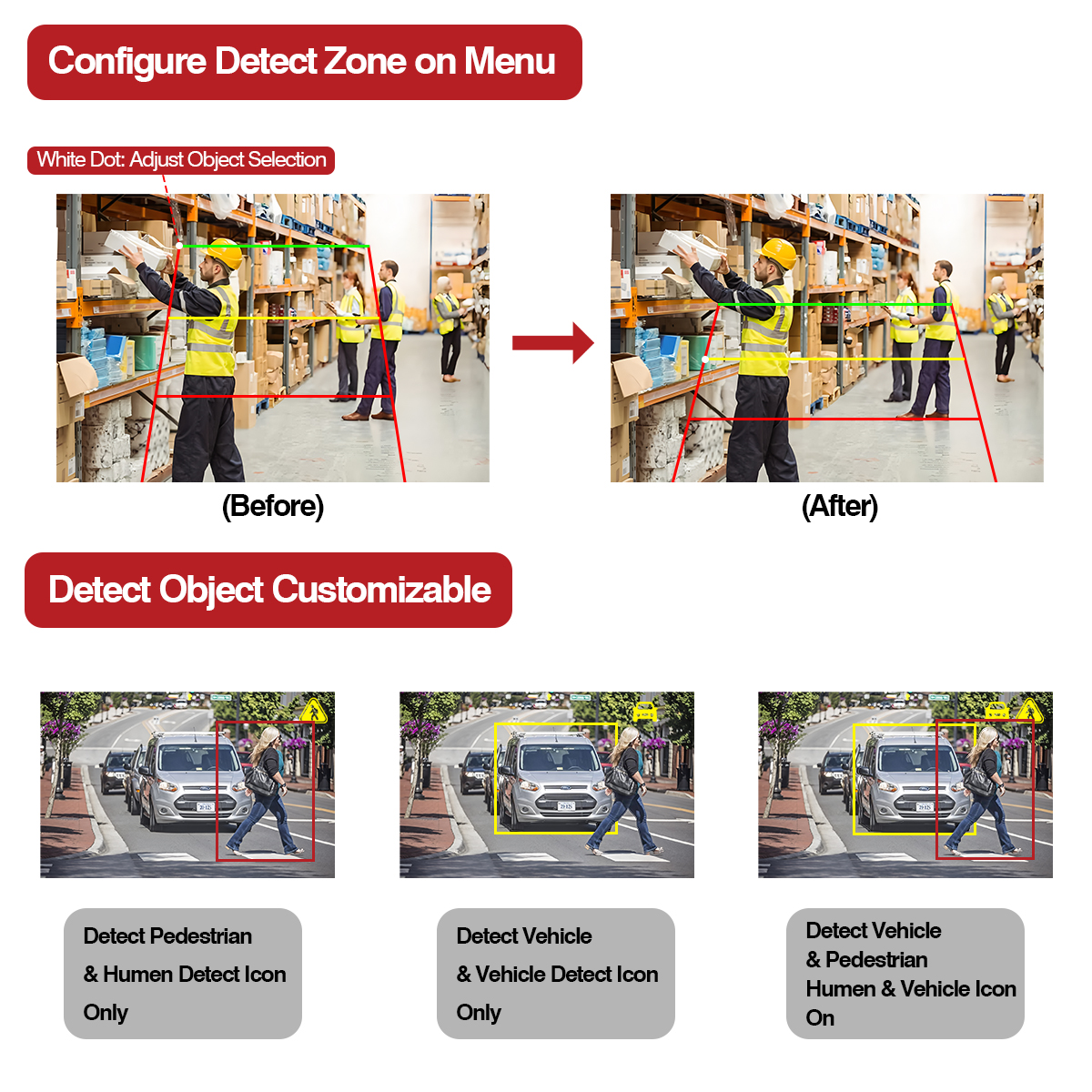 இந்த AI கேமரா உள்ளமைக்கப்பட்ட எச்சரிக்கை ஒளி செயல்பாடு, கண்டறிதல் பொருள் வெவ்வேறு கண்டறிதல் பகுதியில் (சிவப்பு, மஞ்சள், பச்சை) நுழையும் போது, ஒளி நிறம் தொடர்புடைய நிறத்திற்கு மாறும். உங்கள் வாகனத்திற்கு அருகில் வரும் பாதசாரிகள் மற்றும் வாகனத்தை அலாரம் செய்ய அலாரத்துடன் ஒருங்கிணைக்கவும்.