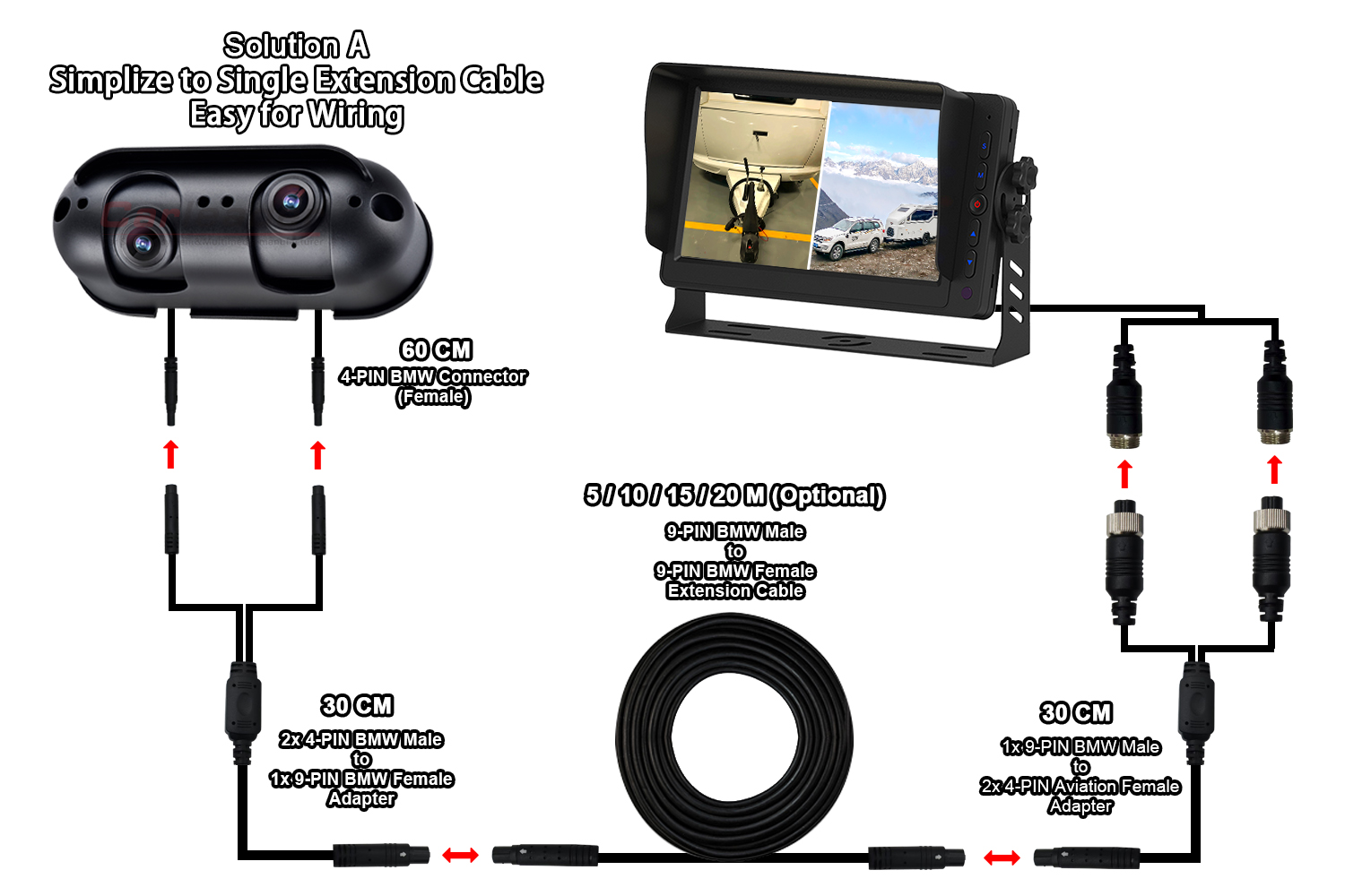 முதல் தீர்வு ஒரு நீட்டிப்பு கேபிள் (9-PIN BMW கனெக்டர்), கேமரா மற்றும் மானிட்டரை இணைக்க இரண்டு முனைகளுக்கும் 1 முதல் 2 பிளவு கேபிள் மட்டுமே பயன்படுத்துகிறது. ஏனெனில் இந்த தீர்வு நீட்டிப்பு கேபிளில் மட்டுமே உள்ளது, இது வயரிங் செயல்முறையை எளிதாகவும் வசதியாகவும் செய்கிறது.