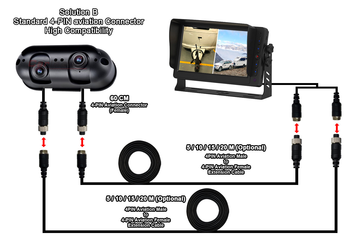AHD Starlight Dual Lens Rear View Camera Fit RV Motorhomeக்கு, வெவ்வேறு வயரிங் தேவைகளுக்கு ஏற்ப Carleader இரண்டு வெவ்வேறு வயரிங் தீர்வை வழங்குகிறது: