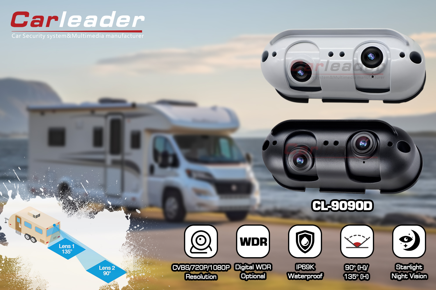 கார்லீடர்AHD ஸ்டார்லைட் டூயல் லென்ஸ் ரியர் வியூ கேமரா RV Motorhome க்கு ஏற்றது, கார்லீடரின் ஒரு தனியார் கருவி AHD பின்புறக் காட்சி கேமரா, டூயல் லென்ஸ் வடிவமைப்பு பயனருக்கு நெருக்கமான மற்றும் தொலைதூர ரியர்வியூ பார்வையின் தெளிவான தெரிவுநிலை செயல்திறனைப் பெற அனுமதிக்கிறது. இதன் அலுமினியம் அலாய் ஹவுசிங் மற்றும் IP69K ரேட்டிங்கும் கேமராவை எந்தக் கடுமையான வானிலையிலும் உறுதியானதாகவும் நீடித்ததாகவும் ஆக்குகிறது. இந்த கேமரா டிரக், பஸ், ஃபோர்க்லிஃப்ட் போன்ற கனரக வாகனங்களுக்கு மட்டும் பொருந்தாது; RV மற்றும் கேரவன் போன்ற மோட்டார் ஹோம் வாகனத்திற்கும் ஏற்றது.