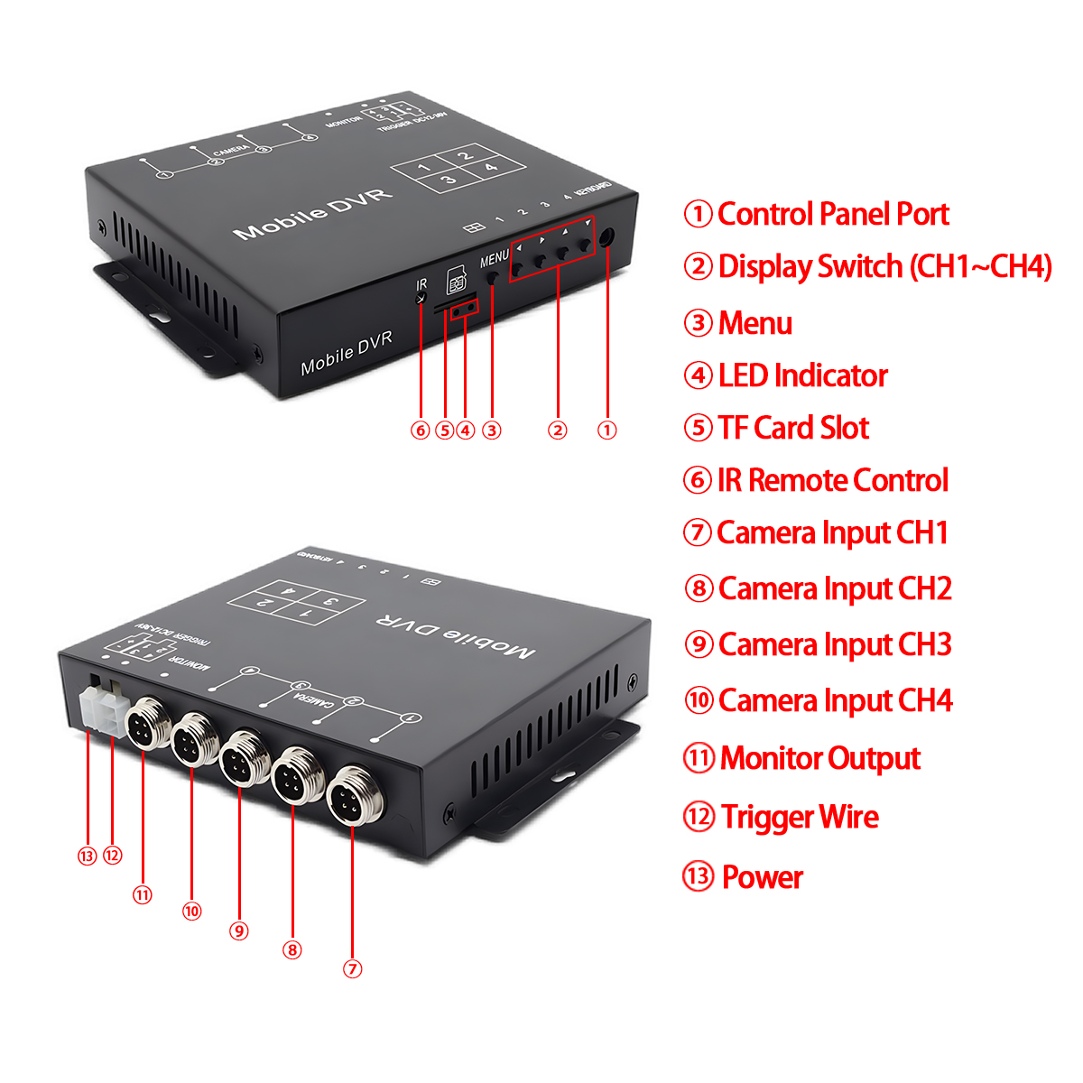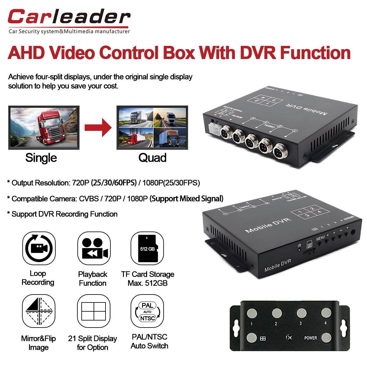 கார்லீடர் குவாட் வீடியோ ஸ்ப்ளிட்டர் பாக்ஸ், டிவிஆர் ரெக்கார்டிங் செயல்பாட்டின் பாதுகாப்புடன் 4சிஎச் வீடியோ ஸ்ப்ளிட்டர் பாக்ஸின் வசதியை ஒருங்கிணைக்கிறது. தனி பட அமைப்பு, நெகிழ்வான தூண்டுதல் முறைகள் (தூண்டுதல் கம்பி & ரிமோட் கண்ட்ரோல்), திரை விளிம்பு சரிசெய்தல், பரந்த மின்னழுத்த உள்ளீடு மற்றும் வலுவான பாதுகாப்பு உள்ளிட்ட அதன் விரிவான அம்சத் தொகுப்பு - தேவைப்படும் மொபைல் சூழலுக்கு ஏற்ற நம்பகமான மற்றும் உயர்தர கண்காணிப்பு தீர்வை வழங்குகிறது. கார்லீடர் 1080P AHD குவாட் ஸ்பிளிட் டிஸ்ப்ளே வீடியோ செயலி ஆதரவு வீடியோ பதிவு மூலம் முழுமையான சூழ்நிலை விழிப்புணர்வு மற்றும் பாதுகாப்பான வீடியோ ஆதாரத்தை உறுதி செய்யவும்.